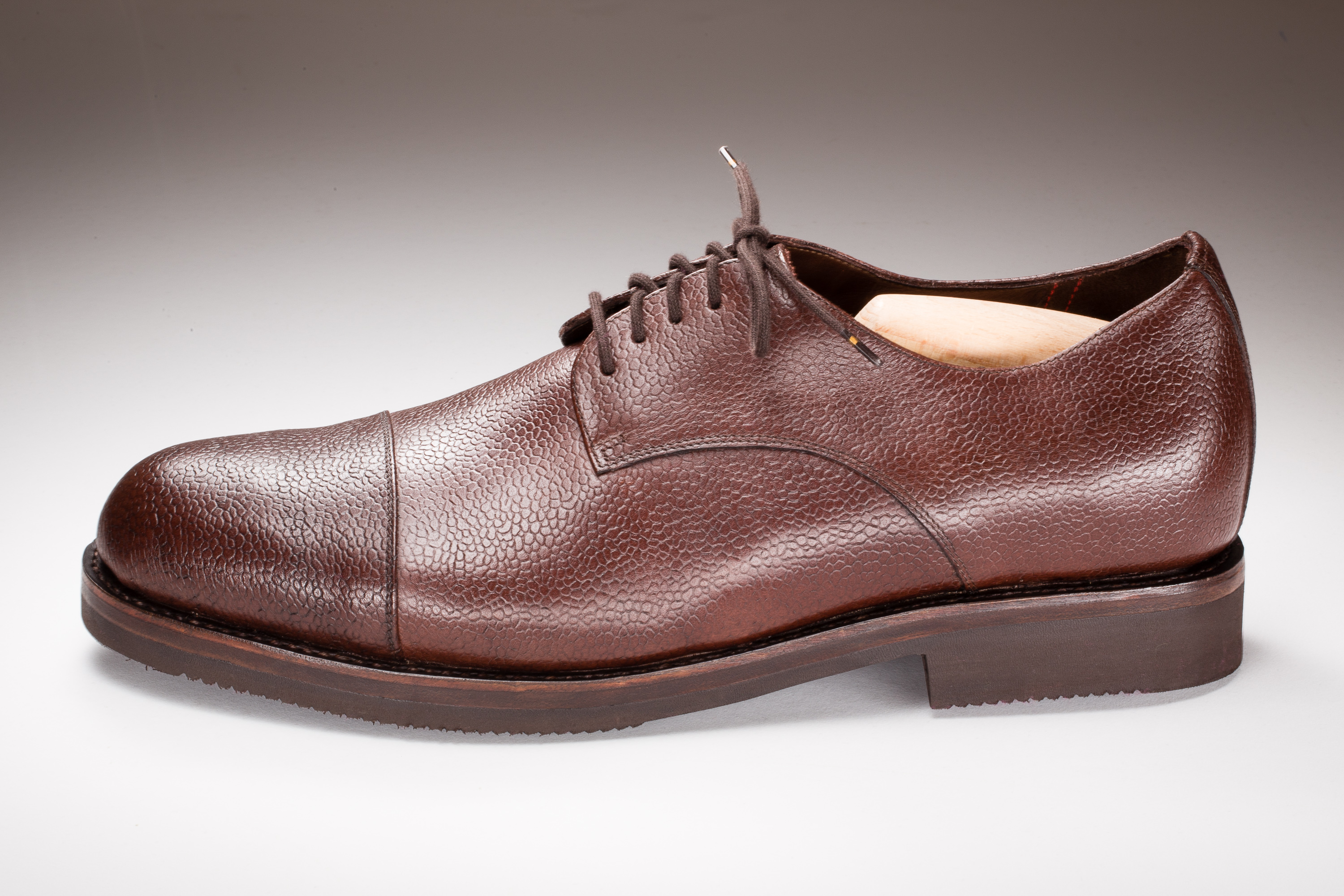 Der schlammfarbene Budapester hat eine eher sportlich elegante Form mit doppelter Ledersohle. Die Farbgebung ist individuell gestaltet und verleiht dem Modell die gewünschte Patina.