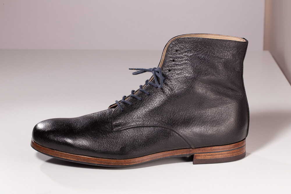Dieser Stiefel begleitet Musiker, Schauspieler aber auch Private Clubgänger. Eine leichtes Plateau ermöglicht Komfort in spektakulärem Ambiente. Variation einmal mit Einem aus Leder aufgebautem Absatz und einmal in einer leichteren Variante mit einem bezogenen Holzabsatz.